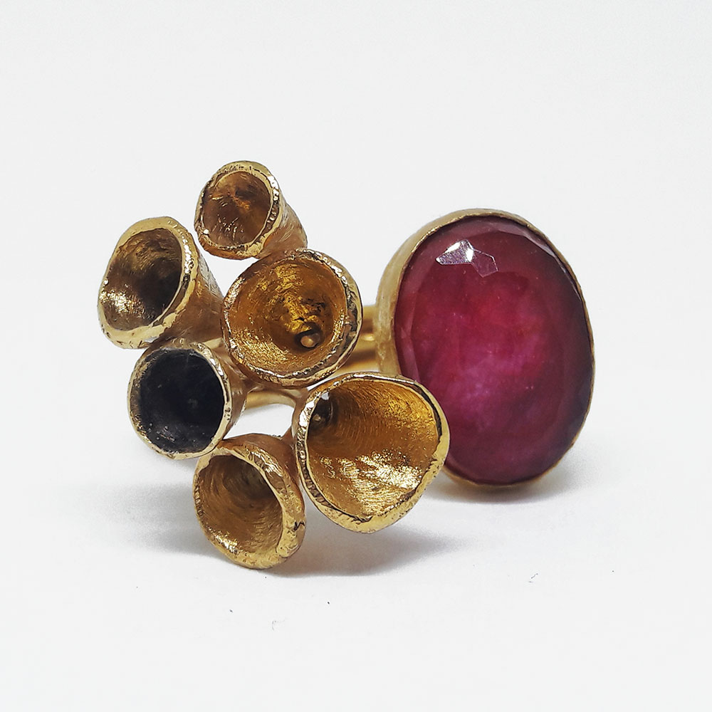 Unique handmade silver gold plated ring with ruby root stone.